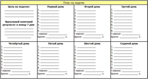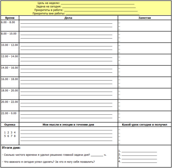 Время – это деньги. Поэтому ведите ежедневный учёт времени и каждый вечер отмечайте в специальной таблице с помощью галочек, крестиков, заштриховываний, сердечек, букв или любых иных обозначений, сколько часов в день вы были заняты делом (тем, что ведёт вас к поставленным целям), сколько часов в день вы работали над собой (физические упражнения, дыхательные упражнения, развитие интеллекта, совершенствование профессионального мастерства