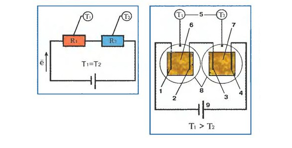 In the first experiments, as resistance, I used incandescent lamps (calculated for a voltage of 2.5 V and a current of 0.15 A). Turning on the current (its source was a reducing stabilizing transformer and a rectifier included in a household circuit with a voltage of 220 V), I measured the temperature in thermostats for an hour; then changed the lamps in places and repeated the measurements. Five series of similar experiments showed that the metallic resistances gave off the amount of heat in full accordance with the classical laws of electrical engineering, and no matter where these resistances were located.