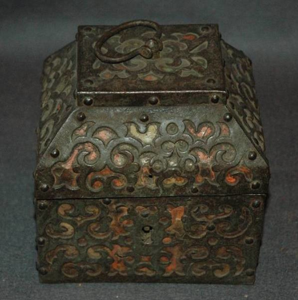 Кроме рассмотренных видов изделий, московские мастера делали бесчисленное количество других, широко использовавшихся в домашнем хозяйстве для хранения «мягкой рухляди», посуды, оружия, документов. Следует упомянуть о больших деревянных сундуках, обитых фигурными просечными полосами железа (на всех сторонах, крышке и углах)56. Они имели прямоугольную форму, крышка была покатая или плоская57. На боковых сторонах располагались большие литые ручки. Для хранения приданого использовались большие глубокие сундуки с покатой крышкой. Они были обиты со всех сторон широкими листами, украшенными богатым растительным орнаментом в технике просечки и чеканки. Такие сундуки ставились на резные ножки. Вместо металлических листов могла использоваться роспись, состоящая из сюжетных сцен, геометрических и растительных мотивов. Для путешествий использовались полукруглые сундуки-баулы, обитые шкурой нерпы58. О повсеместном распространении (от царских хором до изб бедного люда) сундуков, ларцов и шкатулок писал Н. И. Костомаров59.