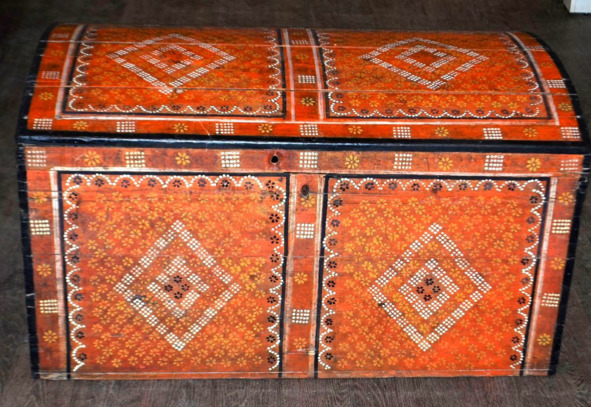 Надо отметить, что «подносная» роспись очень ценилась владельцами сундука. Были случаи, когда жестяные листы снимались с ветхого изделия и прикреплялись к другому, более новому. Примером может быть сундук из коллекции МИХМ142. Жестяные листы с росписью прикреплены к простому сундуку, окрашенному в синий цвет и обитому полосами «в сетку». Украшение одного вида сундуков, использованное для декорировки другого, придало эклектичный характер внешнему виду изделия. Сегодня этот интересный предмет может служить свидетельством сложности истории местного сундучного промысла.