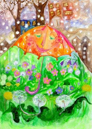 – Нет! Ну что ты! За то, что ты придумала, как победить гусениц, я подарю тебе одну волшебную вещь! – и тут Фея Фиалок достала старенький, весь разрисованный какими-то неизвестными невзрачными цветами огромный зонт, с большой изогнутой ручкой, сделанной из орешника. Фея Фиалок раскрыла его и – о чудо! – На глазах у изумлённых друзей под зонтом начали расцветать незабудки, одуванчики и другие замечательные цветы.