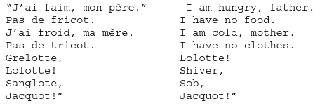 “Dieu de Dieu! how my sister and I have hunted! And it was you who found it! On the boulevard, was it not? It must have been on the boulevard? You see, we let it fall when we were running. It was that brat of a sister of mine who was so stupid. When we got home, we could not find it anywhere. As we did not wish to be beaten, as that is useless, as that is entirely useless, as that is absolutely useless, we said that we had carried the letters to the proper persons, and that they had said to us: ‘Nix.’ So here they are, those poor letters! And how did you find out that they belonged to me? Ah! yes, the writing. So it was you that we jostled as we passed last night. We couldn’t see. I said to my sister: ‘Is it a gentleman?’ My sister said to me: ‘I think it is a gentleman.’”
