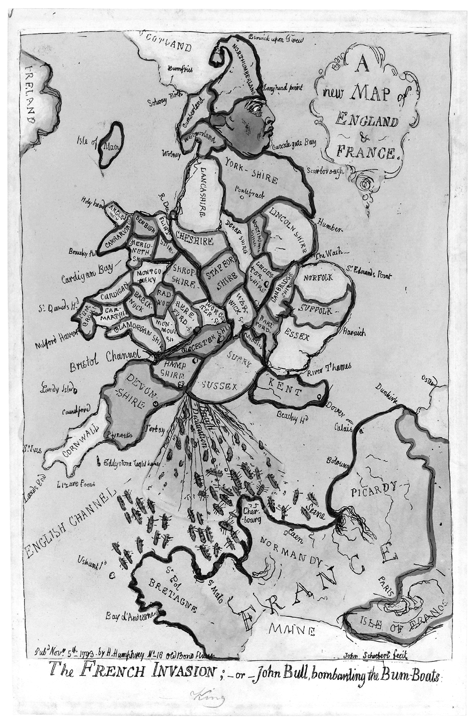 James Gillray’s map of England as King George III, crapping ‘bum boats’ into France’s mouth