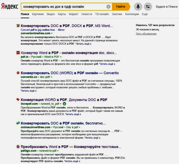 Для переформатирования файлов существуют конверторы. Чтобы найти в интернете нужный конвертор, нужно в браузере поисковой системы написать, например: конвертировать из док в пдф (смотрите скриншот ниже), и нажать – «Найти».
