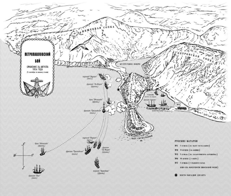 Наступает «роковой»[319], как назовут его потом защитники Петропавловска, день 20 августа – хотя роковым он станет, скорее, для союзников. Ещё с ночи русские наблюдают частые сигналы, которыми обмениваются вражеские корабли, видят, что идёт промер глубин, и вот в шесть утра неприятель начинает поднимать якоря. К девяти англо-французская эскадра выстраивается в боевой порядок на расстоянии пушечного выстрела от Сигнальной батареи. В центре – «Вираго», слева от него – «Президент», справа – французский флагман фрегат «Форт» («Forte») и за ним – английский «Пик» («Picque»). Два остальных корабля (французские корвет[320] «Эвридика» /«Eurydice»/ и посыльное судно[321] «Облигадо́» /«Obligado»/) стоят поодаль. В пять минут десятого сражение начинает батарея № 4 – та самая, которую днём раньше враг вроде бы «захватил». Тут же отвечают союзники, подключаются прочие береговые орудия, и бал начинает править смерть. Следует подчеркнуть, что для защитников Петропавловска (за исключением, пожалуй, Завойко) это был первый в их жизни бой.