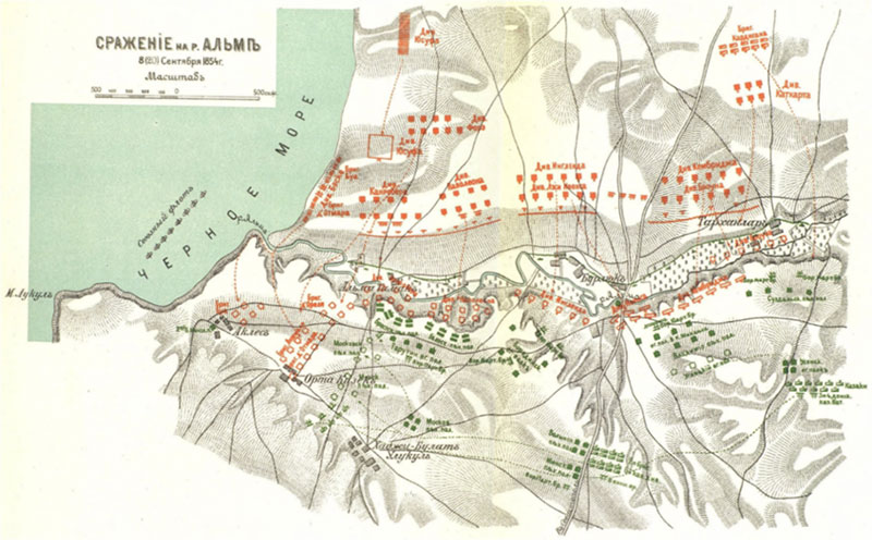 Учитывая явное неравенство сил, Меншиков решает укрепиться на левом берегу реки Альма при впадении её в Чёрное море, примерно в 30 километрах от Севастополя, и, преградив противнику дорогу к городу, дать сражение, рассчитывая, как минимум, задержать его. А союзная армия, завершив высадку, в девять часов утра 19 сентября[405] выступает ускоренным маршем из-под Евпатории и направляется вдоль морского берега ему навстречу. Англо-французский флот идёт параллельно. В тот же день, к двум часам дня передовые части обеих армий встречаются, происходит короткая стычка, и противники располагаются в шести километрах друг от друга в ожидании следующего дня.