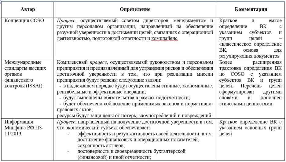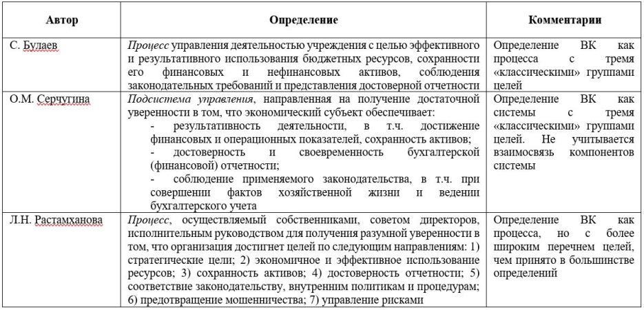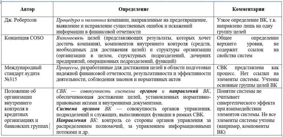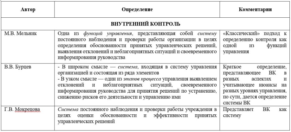 Рассмотрим подходы к определению понятий «внутренний контроль» (далее – ВК) и «система внутреннего контроля» (далее – СВК). В табл. 1 приведены определения из научных источников и регулирующих документов с комментариями авторов.
