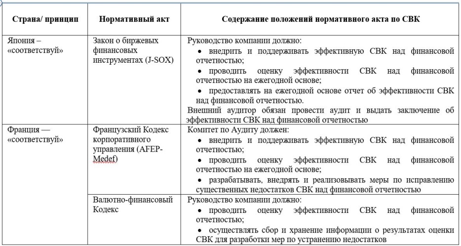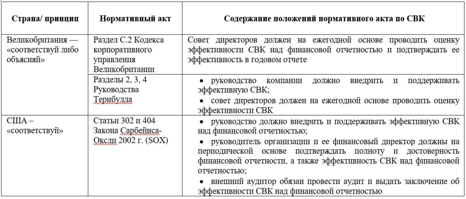 В регулирующих документах по вопросам корпоративного управления различных стран присутствуют требования по оценке СВК и поддержанию ее в эффективном состоянии. Краткий обзор приведен в табл. 2.