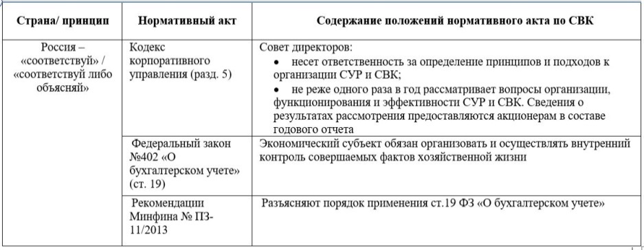В России многие положения международных концепций и правил нашли отражение на законодательном и нормативно-методическом уровне. Например, в закон «Об акционерных обществах» внесены положения о системах управления рисками и внутреннего контроля публичных обществ, требования российских бирж по внутреннему контролю для эмитентов, ценные бумаги которых допущены к торгам, аналогичные требованиям мировых торговых площадок, а Банком России издан Кодекс корпоративного управления, устанавливающий рекомендации к системам управления рисками и внутреннего контроля для крупных компаний, введены в действие Международные стандарты аудита, устанавливающие в том числе и требования к организации внутреннего контроля аудируемых лиц.