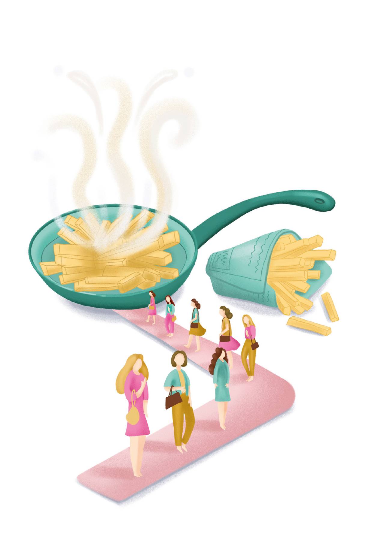 Однажды Алиса сделала новый аккуратный заход, увидев, что вытворяет Рита. Та улеглась на диванчике, поставила на грудь сковородочку с жареной картофельной соломкой, залезла в нее пальцами, а потом ухватилась за страницу книжки. Книжка была дешевой, но Алису все равно слегка передернуло. “И что! – тут же с вызовом отреагировала Рита, зацепив периферийным зрением реакцию Алисы. – Я люблю картошечку. Люблю и буду любить, пока не помру от ожирения или от чего там помирают любители картохи. Иди-иди сюда, мой канцерогенчик!” – Рита схватила пальцами золотой “карандашик”, чтобы отправить в рот. Алиса, смеясь и поддразнивая подругу, ловко перехватила картофельный кусочек и… удивилась, как давно не ощущала этого вкуса, кажущегося сейчас почти незнакомым и совсем неинтересным. Еще пять лет назад Алиса бежала с работы в ближайший фаст-фуд и забирала оттуда домой большое ведро картошки фри, вгрызалась в нее, жевала, мычала от удовольствия. В те дни она даже не понимала, что, поедая гигантские ведра, занималась самоедством: заедала стресс, щедро солила любовные раны, прижигала прогорклым маслом старые обиды.