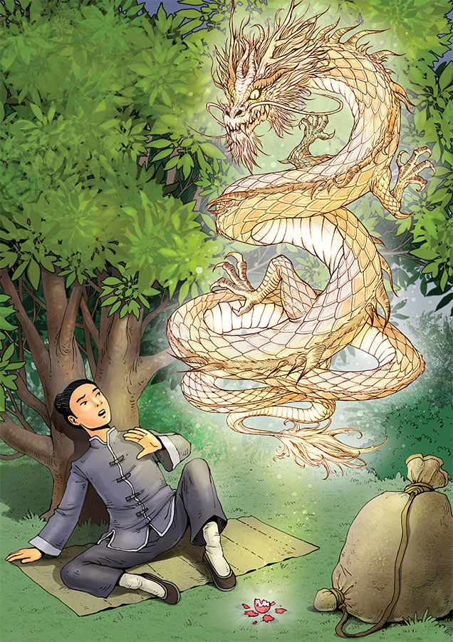 И тут он почувствовал, как скорлупа потеплела. Да, потеплела! В испуге Тао дёрнул рукой, чуть не выронив яйцо… И тут оно начало трескаться. Рывками и с хрустом, как откалывается айсберг от большого ледника. Вот откололась верхушка, и из такого маленького, казалось, пространства, на свет вырвался полупрозрачный, светящийся неярким белым светом змей-дракон! Он взвился до макушки дерева и перекувыркнулся, явно празднуя высвобождение, а затем мягко опустился на землю перед Тао. Тот глядел на него, боясь шелохнуться.