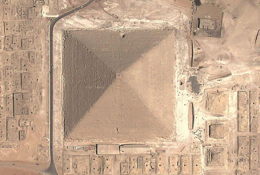 Прим: приведенная фотография, на которой показан вид сверху на известную пирамиду Хеопса, наглядно иллюстрирует написанные утверждения. Видны четыре треугольные грани по-разному освещенные солнцем. Напротив самой светлой грани находится самая темная грань. И все грани сходятся к одной точке, общей вершине пирамиды и треугольников.