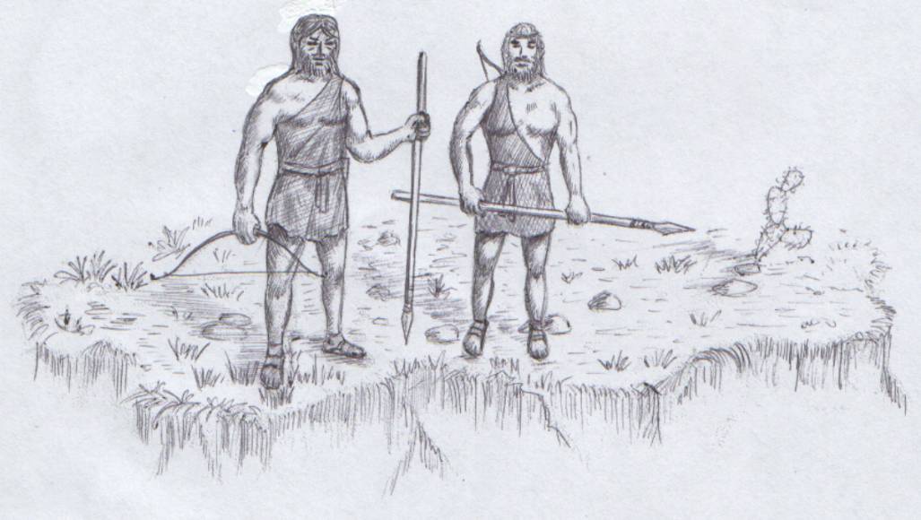 Спотыкаясь от усталости, запыхавшиеся, но спасенные, охотники поднялись по расщелине на вершину скалы, где была ровная широкая площадка. Там они, наконец, остановились и перевели дух, чувствуя себя в безопасности. По виду это были очень крепкие и сильные мужчины. У каждого был лук, колчан со стрелами и короткий, но острый кинжал висящий в кожаных ножнах за поясом сзади.