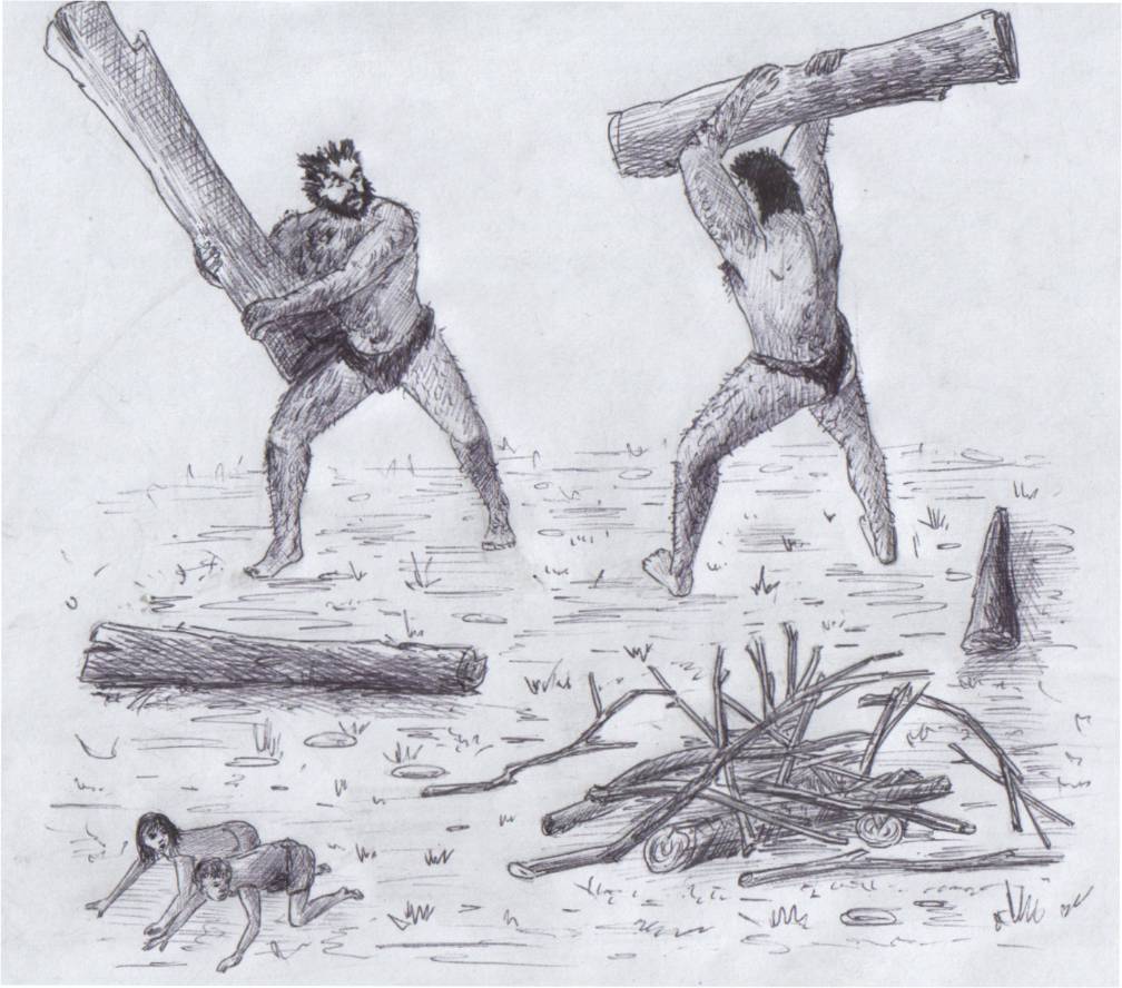 Первый исполин взял тяжелое бревно и, подойдя ко второму, сказал ему что-то угрожающее. Он явно хотел, чтобы тот ушел, но второй, еще более огромный, чем первый, явно игнорируя желание первого, ответил первому с такой ненавистью, что тот моментально вспыхнул от злости и разразился ужасной бранью. Никогда ребятам еще не приходилось наблюдать такой ненависти, исходящей от двух людей, тем более, таких огромных. Через несколько секунд первый великан замахнулся бревном на второго, но тот неожиданно проворно отскочил в сторону и тоже схватился за бревно. Последовала ужасная драка, при этом каждый из Зузимов был невероятно искусен во владении своим деревянным оружием.