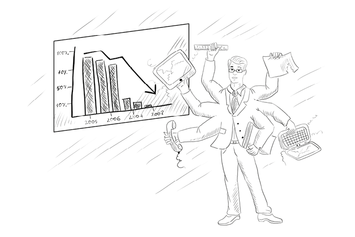 При успешном старте работы компании многие основатели сталкиваются с желанием охватить максимальное количество направлений, подотраслей и покрыть как можно больший территориальный ареал функционирования. Предпринимательские амбиции соединяются с природным желанием мужчины завоевывать и побуждают попытаться предоставить клиентам максимально широкий набор услуг. Под влиянием внутренней уверенности в успехе аппетиты растут и подталкивают к решительным действиям, которые, в свою очередь, нередко приводят к кризису масштаба охвата.