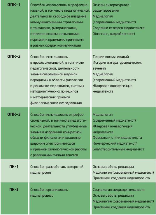 Оказавшись перед необходимостью разработки новой образовательной программы по направлению подготовки 45.04.01 Филология (магистратура) мы попробовали учесть и соблюсти все требования федеральных государственных образовательных стандартов (Федеральный государственный образовательный стандарт высшего образования по направлению подготовки 45.04.01 Филология (уровень магистратура) – ФГОС ВО 3++ проект), использовали необходимые профессиональные стандарты (Профессиональный стандарт «Редактор средств массовой информации» (зарегистрирован в Минюсте России 28.08.2014 № 33899); Профессиональный стандарт «Специалист по производству продукции печатных средств массовой информации» (зарегистрирован в Минюсте России 11.09.2014 № 34035) и применили принципы конвергентности как слияния в единый образовательный продукт двух направлений: филологии и журналистики. Как ни странно – конвергенция такого рода оказалась возможна.