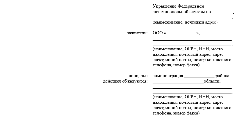 Примерная форма жалобы на положения документации об электронном аукционе.