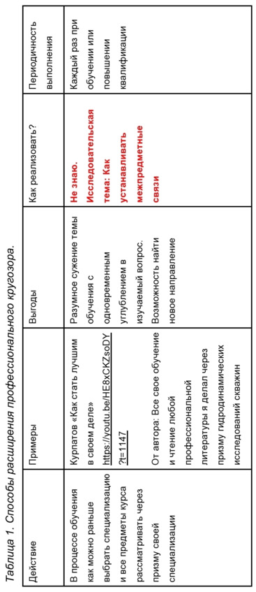 На основании собственного опыта и сбора примеров при подготовке данной работы, выявлены следующие способы расширения профессионального кругозора (см. таблицу 1).