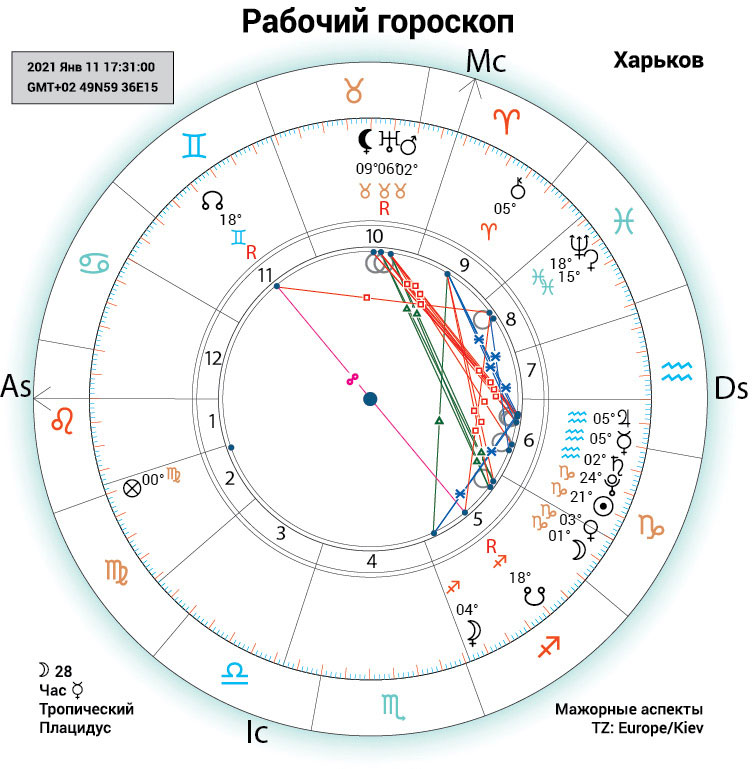 Рабочий гороскоп с датой рождения 11 января 2021 года, 17 часов 31 минута, Украина, Харьков. см. рис. 2.1.