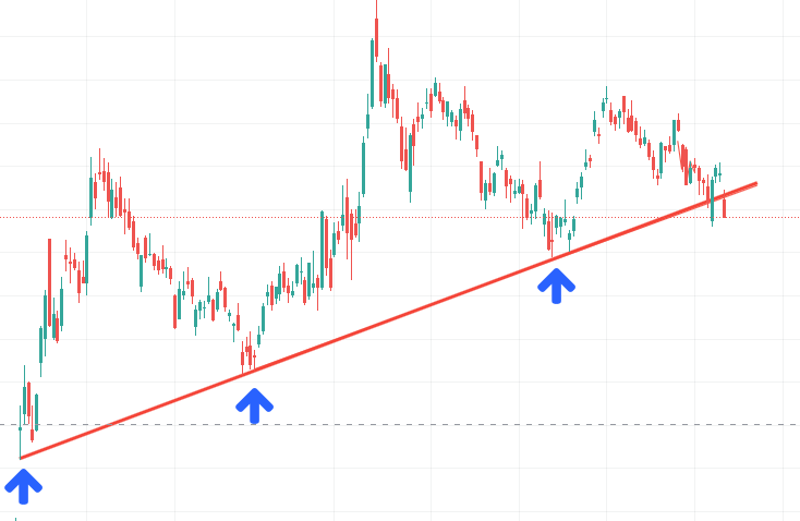 Трендовая линия рисуется следующим образом: берутся минимум три точки и тянется в TradingView линия. Знаю, что некоторые рисуют по двум. Но чем больше точек использовано в построении трендовой, тем тренд сильнее.