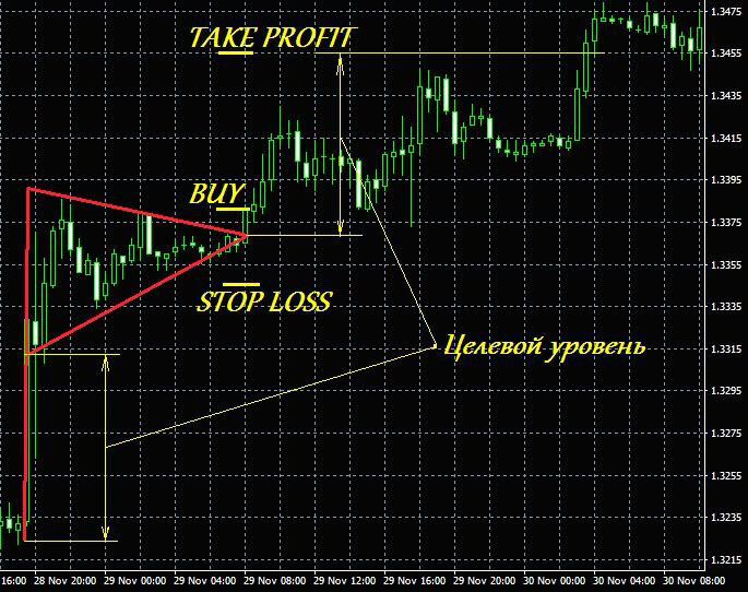 При вымпеле торгуют в направлении пробоя паттерна, то есть можно открыть длинную позицию сразу после выхода цены из фигуры.