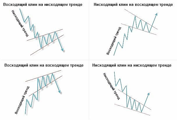 Клин – это разворотная фигура и модель продолжения тренда одновременно. На графике формируется восходящий или нисходящий клин.