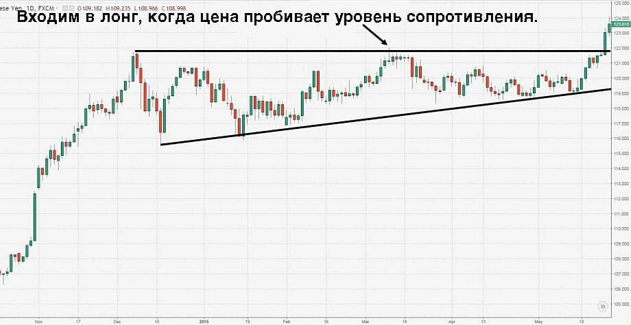 При нисходящем клине ждем, когда цена выйдет за пределы фигуры, и открываем покупку.