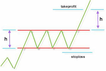 ПрямоугольникМодель продолжения тренда – прямоугольник. Фигура появляется на графике, когда цена находится между уровнем поддержки и сопротивления. Это часто происходит после пробития уровня. Дальше цена не идет, а находится примерно на одном уровне.