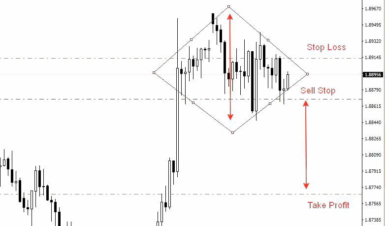 • Take profit устанавливают по ширине ромба, откладывая такое же расстояние от точки пробоя правой грани. Если тренд бычий, откладываем вниз, если медвежий – вверх.