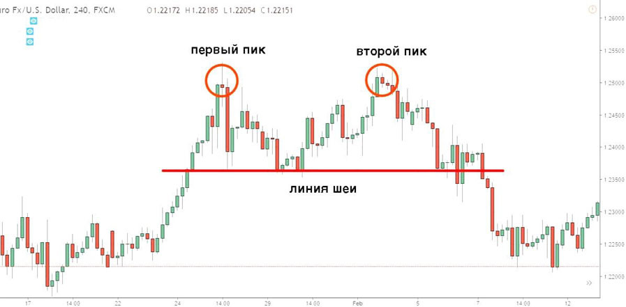На графике данные фигуры указывают на точки разворота цены. В случае с двойной вершиной (дном) есть два пика и линия шеи. При анализе ситуации важно, чтобы вершины были далеко друг от друга. Это говорит о большой значимости уровня, от которого они отталкиваются.