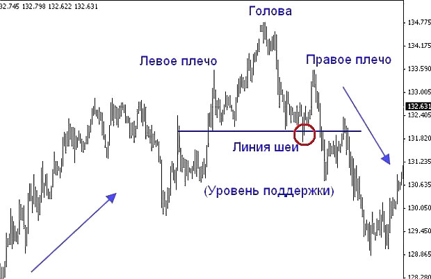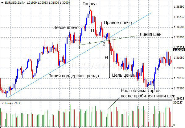 Фигура образуется при восходящем тренде и говорит о скором развороте цены. Зеркальный вариант фигуры – голова и плечи – образуется при нисходящем тренде.