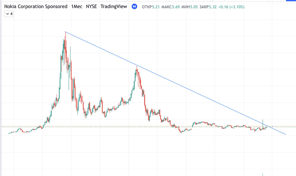 Дальше мы перешли на дневной таймфрейм. Снова видим, что тренд восходящий. Опять построили уровни поддержки и сопротивления. Понимаем, с какого уровня у нас может быть пробой, и нужно открыть лонг. Но если мы откроем месячный таймфрейм, то увидим, что акция Nokia находится в многолетнем, затяжном, ниспадающем тренде. Он длится уже 20 лет. И точка пересечения ниспадающего тренда приходится на наше время. Поэтому мы не торгуем против тренда. Забываем про акцию Nokia до тех пор, пока она не пробьет нисходящий тренд.