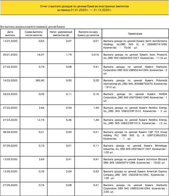 Вы видите, что, например, мне заплатили дивиденды 20.01.2020 в размере 16,07 долларов США, при этом 1,79 с меня удержали, это 10 %, и мне осталось доплатить положенные 3 % нашему государству.