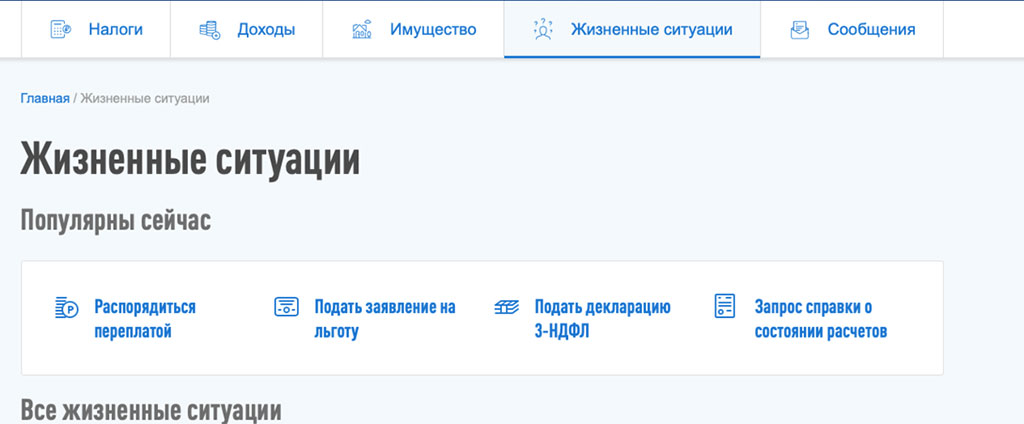 Далее попадаем в личный кабинет и кликаем на «ЖИЗНЕННЫЕ СИТУАЦИИ».