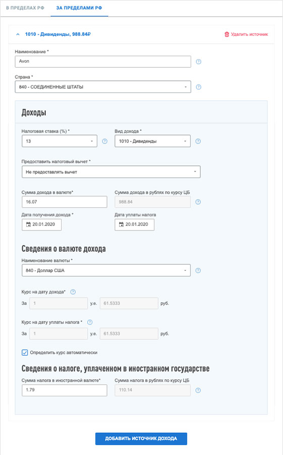 ВАЖНО указать дату получения дохода, так как к ней будет подтягиваться официальный курс на тот день!