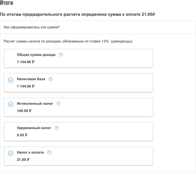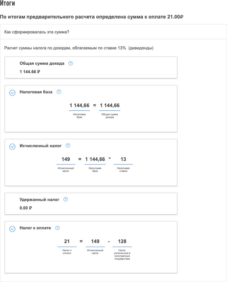 И мы видим, как система подробным образом расписывает, как получился налог 21 рубль.