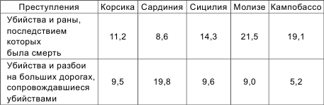 Сравнивая между собой число лиц, осужденных за убийство в течение 1880–1883 годов на Корсике, с числом таких же осужденных в наиболее преступных областях Италии, мы получаем следующие данные: