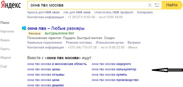 Очень действенный способ. В браузер компьютера вводим необходимую нам фразу «Окна ПВХ» и смотрим на выпадающее меню слов – это и есть наши подсказки. ПС так делает нам доброе дело. Выписываем необходимые для нашего сайта ключевые слова и фразы и вносим в свой список. Далее скролим страницу выдачи вниз – и вот вам еще подсказки. Внизу каждой страницы поисковой выдачи есть перечень слов и фраз, по которым пользователи уже проводили поиск, и эти слова и фразы уже «прописаны» в интернете.