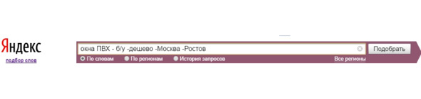 Например, «Окна ПВХ», не хотим видеть эту фразу со словами б/у, дешево, в Москве, В Ростове.