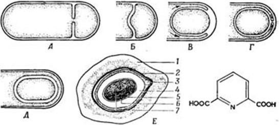А, Б – образование септы; В, Г – окружение протопласта споры мембраной материнской клетки; Д – формирование кортекса и оболочек споры; Е – схема строения зрелой споры: 1 – экзоспориум; 2 – наружная оболочка споры; 3 – внутренняя оболочка споры; 4 – кортекс; 5 – клеточная стенка споры; 6 – ЦМ споры; 7 – цитоплазма с нуклеоидом