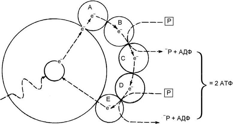 Рис. 18. Процесс циклического фосфорилирования, посредством которого в молекуле хлорофилла электрон, перенесенный на более высокий энергетический уровень благодаря поглощению фотона света, обеспечивает энергию, необходимую для образования АТФ (по А. Ленингеру)