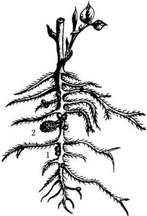 Рис. 19. Рисунок Мальпиги (XVII в.), изображающий корни бобового растения с корневыми клубеньками (1) и оболочкой семени (2), из которого развилось данное растение