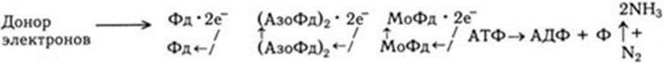Цепь переноса электронов состоит из ферредоксина (Фд), азоферредоксина (АзоФд) и молибдоферредоксина (МоФд), и за один раз переносятся только два электрона. Для последнего переноса расходуется 1 молекула АТФ.