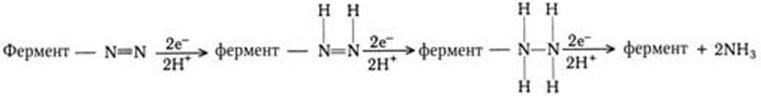 Азотфиксирующие бактерии восстанавливают азот (N2) до NH3 с помощью сложной ферментной системы нитрогеназы, содержащей железо, молибден, магний. Эта система нуждается в источнике электронов, которые поступают через восстановитель с низким потенциалом, содержащий негеминовое железо – ферредоксин (переносчик электронов).
