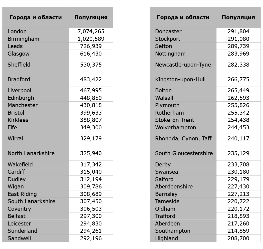 Чем крупнее города, тем больше шансов найти хорошую работу, дешёвое жильё и тем больше возможность хорошо и интересно провести свой досуг. На следующей странице, на всякий случай, приводится таблица самых больших городов Великобритании. Из моего опыта скажу, что работу можно найти довольно легко в городах, с населением больше 170.000, но и в меньших при желании и упорстве Вы сможете устроиться. Только учтите, что чем меньше город, тем тяжелее найти дешёвое жилье.