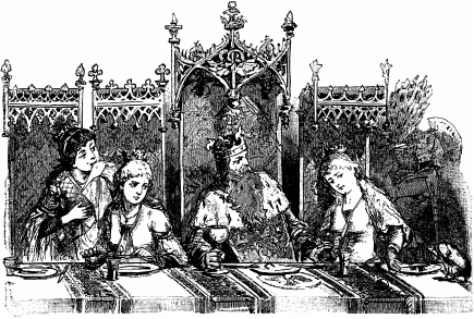 Лягушонок вскочил в комнату и, следуя по пятам за королевной, доскакал до самого ее стула, сел подле и крикнул: «Подними меня!» Королевна все медлила, пока наконец король не приказал ей это исполнить. Едва лягушонка на стул посадили, он уж на стол запросился; посадили на стол, а ему все мало: «Придвинь-ка, – говорит, – свое блюдце золотое поближе ко мне, чтоб мы вместе покушали!»