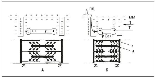 При достаточной частоте нервных импульсов ПКП достигает порогового значения и на мышечной мембране развивается мышечный потенциал действия. Он (со скоростью 5 м/с) распространяется вдоль по поверхности мышечного волокна и заходит в поперечные трубочки внутрь волокна. Повышая проницаемость клеточных мембран, потенциал действия вызывает выход из цистерн и трубочек саркоплазматического ретикулума ионов Са2+, которые проникают в миофибриллы, к центрам связывания этих ионов на молекулах актина.