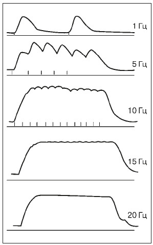 Если интервалы между нервными импульсами короче, чем длительность одиночного сокращения, то возникает явление суперпозиции – наложение механических эффектов мышечного волокна друг на друга и наблюдается сложная форма сокращения – тетанус. Различают две формы тетануса – зубчатый тетанус, возникающий при более редком раздражении, когда происходит попадание каждого следующего нервного импульса в фазу расслабления отдельных одиночных сокращений, и сплошной, или гладкий, тетанус, возникающий при более частом раздражении, когда каждый следующий импульс попадает в фазу сокращения (рис. 11). Таким образом (в некоторых границах) между частотой импульсов возбуждения и амплитудой сокращения волокон ДЕ существует определенное соотношение: при небольшой частоте (например, 5–8 имп. в 1 с) возникают одиночные сокращения, при увеличении частоты (15–20 имп. в 1 с) – зубчатый тетанус, при дальнейшем нарастании частоты (25–60 имп. в 1 с) – гладкий тетанус. Одиночное сокращение – более слабое и менее утомительное, чем тетаническое. Зато тетанус обеспечивает в несколько раз более мощное, хотя и кратковременное сокращение мышечного волокна.