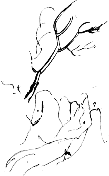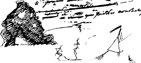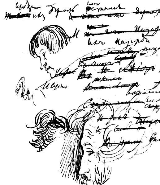 «…На листе № 28 тетради № 2365, среди грудящихся друг на друге рисунков – женских профилей, силуэтов и портрета Гёте – значатся несколько изобличающих слов: «Святой дух призывает Гавриила, открывает ему свою любовь и производит в сводники. Гавриил влюблен. (Это вычеркнуто.) Сатана и Мария»[14].