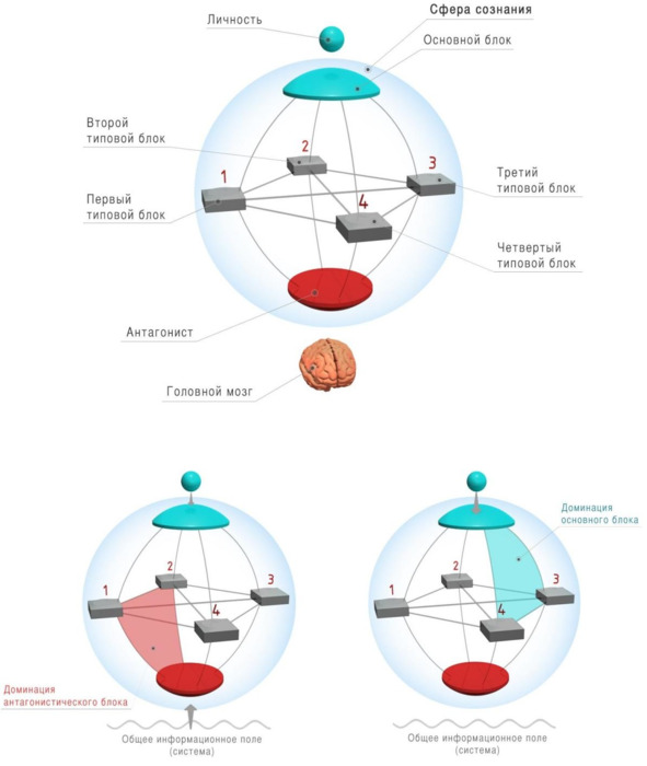 Как объясняет И. М. Данилов в той же передаче, оказать влияние на человека, в сфере сознания которого доминирует основной и четвёртый типовой блок, невозможно, поскольку любое такое влияние осуществляется посредством активации антагонистического и первых двух типовых блоков. Антагонист в этом случае не может главенствовать и оказывать влияние. Сфера сознания находится под полным контролем со стороны Личности. Как это работает мы можем рассмотреть на примере гипноза: